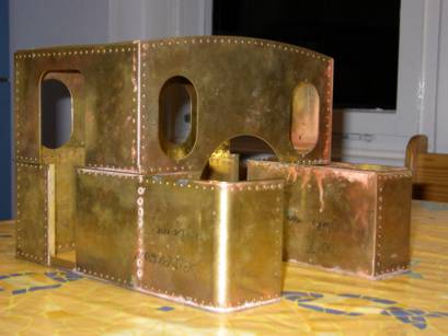 Das Führerhaus aus 1mm Messingblech. Einige Teile wurden vom LSS gelasert gekauft, der Rest wie üblich selbst erstellt und mit Messingwinkel und ca 300 Messingnieten zusammengebaut. Im Bereich der Wasser- kästen wurde zusätzlich weich gelötet um die ganze Sache auch wirklich dicht zu bekommen.