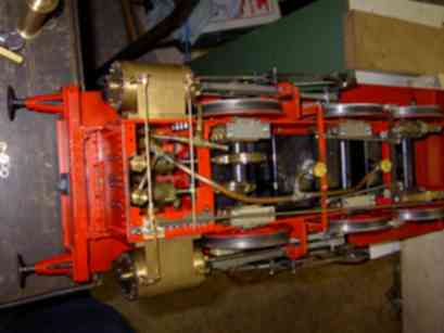 Das ganze von Unten. Zwischen den Zylindern sieht man die beiden Pumpen die während der Fahrt Wasser in den Kessel nachspeisen.