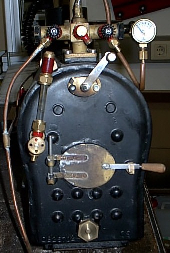 Der Kupferkessel wurde bei Dragon Boilers in England bestellt und komplett mit Dampfdom und Zertifikat geliefert. Mr. Stock von Dragon Boilers hat für diese Maschine bereits mehrere Kessel, auch für LSS, hergestellt. Das Gewicht des Kessels beträgt ca. 11 Kilo, wobei allein der Silberlotanteil bei 250 - 300 gr. liegen dürfte.